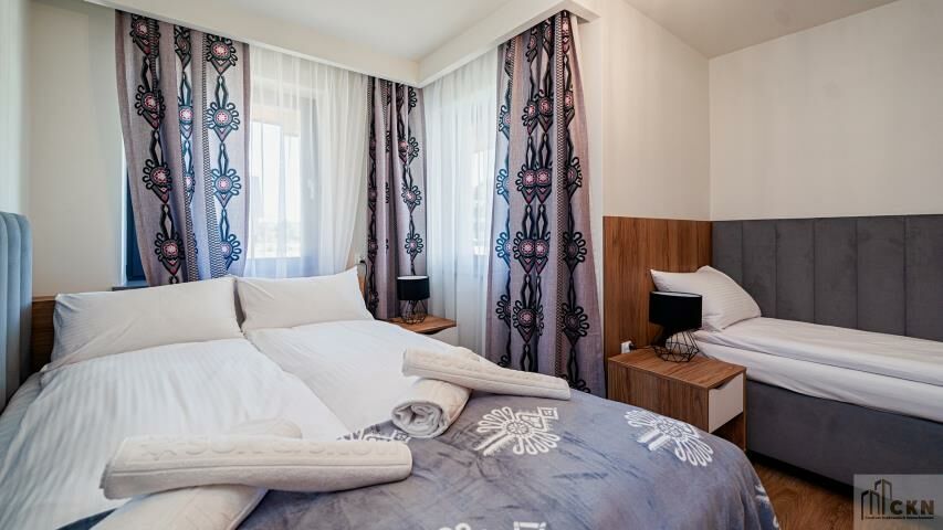 Pokoje: 3 (w tym salon z aneksem kuchennym)Łóżka: 3 jednoosobowe, 2 dwuosobowe (w tym rozkładana sofa dwuosobowa, łóżko w systemie hotelowym i łóżko małżeńskie)